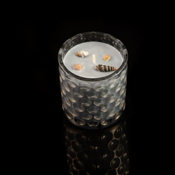 Natūralaus sojų vaško kvepianti žvakė, dekoruota natūraliomis kriauklytėmis ir kitomis jūros dekoracijomis.