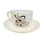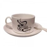 Komplektą sudaro puodelis, šaukštelis ir lėkštutė.