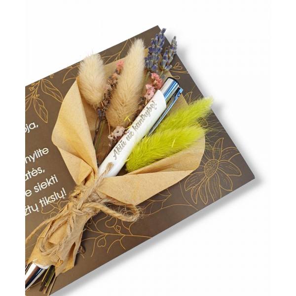 Sveikinimas-dovana su džiovintų gėlių kompozicija bei graviruotu tušiniu leis ne tik nustebinti Jūsų mylimą Mokytoją, bet ir privers nusišypsoti!