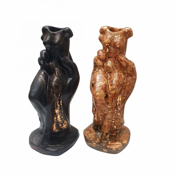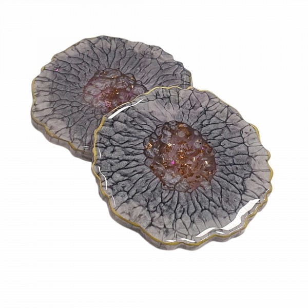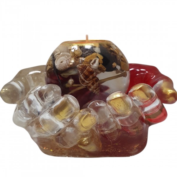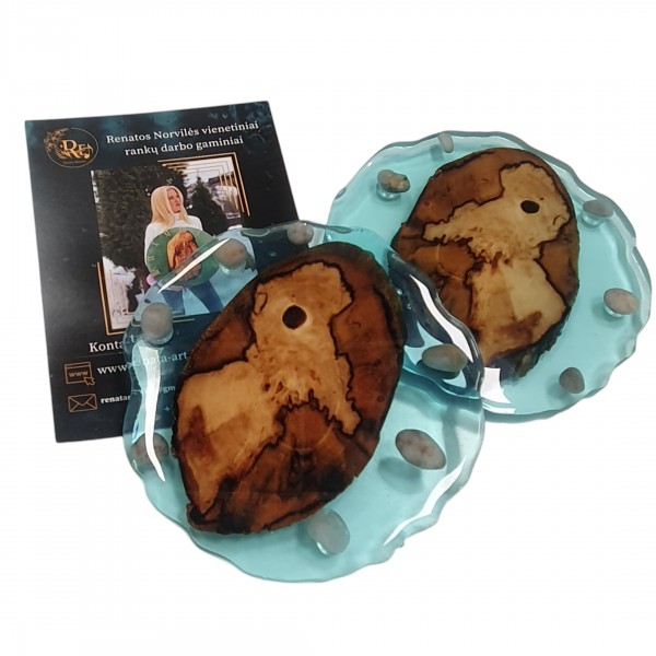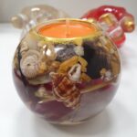 Rankų darbo žvakidžių komplektas, kuriame natūralūs akmenys, kriauklytės ir kiti gamtos lobiai įamžinti epokside.